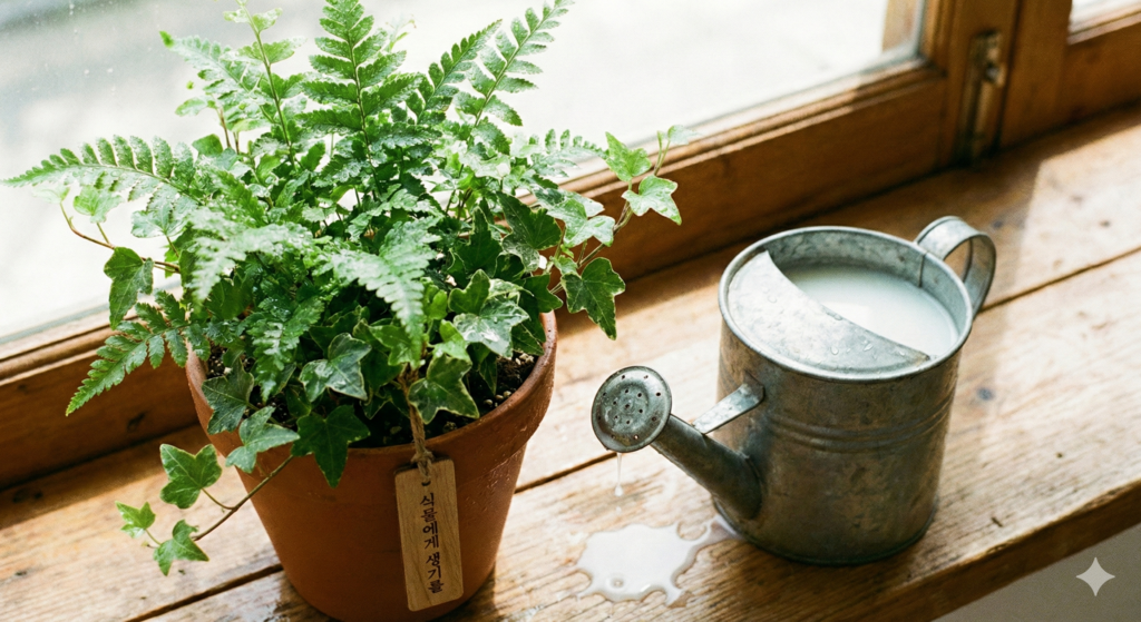 - 사용 방법: 유통기한 지난 우유와 물을 1:5 정도의 비율로 희석하여 사용합니다. (물 5컵에 우유 1컵) 희석하지 않은 우유를 그대로 주면 흙이 굳거나 냄새가 날 수 있으니 반드시 희석해서 사용해야 해요. 희석한 우유를 식물의 흙에 골고루 뿌려주거나 잎사귀에 스프레이 해주면 된답니다. 한 달에 1~2회 정도 주면 적당하며, 너무 자주 주는 것은 피해주세요.