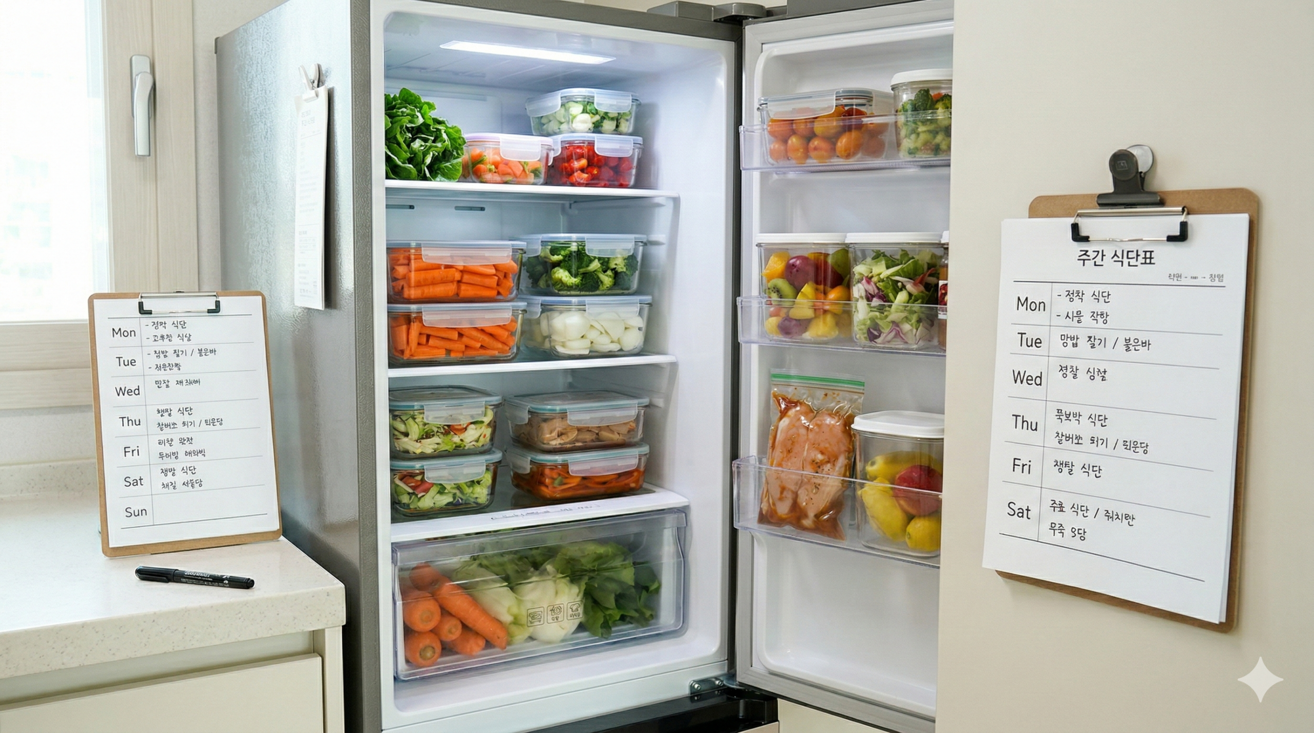 밀프렙의 기본 원리는 ‘계획’과 ‘준비’입니다. 먼저 이번 주에 먹을 식단을 정하고, 이에 필요한 냉장고 속 식재료를 확인해요. 부족한 재료만 최소한으로 구매한 후, 주말이나 여유로운 시간에 미리 손질하거나 조리해두는 것이죠. 예를 들어, 닭가슴살은 삶거나 구워서 소분해두고, 채소는 씻어서 잘라 밀폐 용기에 보관하는 식이에요. 이렇게 해두면 평일에 간단하게 조합하여 한 끼 식사를 완성할 수 있답니다. 밀프렙의 가장 큰 장점은 식비 절약이에요. 충동적인 외식이나 배달 음식 주문을 줄일 수 있고, 식재료 낭비를 막을 수 있어요. 또한, 건강 관리에도 효과적인데요. 균형 잡힌 식단을 미리 구성할 수 있어서 영양 불균형을 예방하고, 가공식품 섭취를 줄일 수 있어요. 시간 절약은 물론, 요리할 때의 스트레스까지 줄여주니 일석다조의 효과를 볼 수 있습니다.