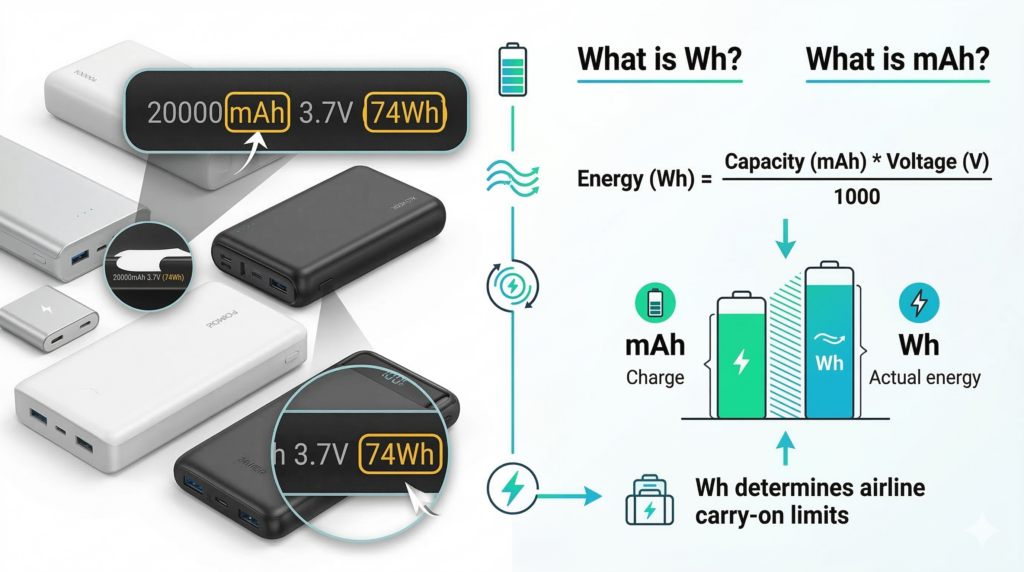 A. [용량(mAh) × 전압(V) ÷ 1000] 공식을 사용하세요. 보통 보조배터리의 전압은 3.7V이므로 20,000mAh는 약 74Wh가 됩니다.