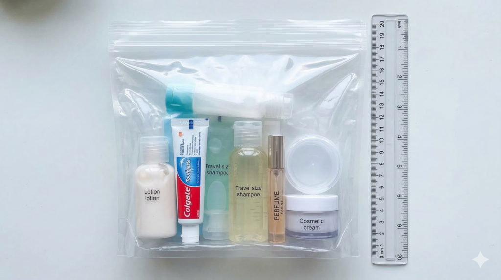 각 액체류는 개별 용기당 100ml 이하에 담겨 있어야 해요. 여기서 중요한 점은 내용물이 조금 남았더라도 용기 자체가 100ml를 넘으면 반입이 안 된다는 것이에요. 이 용기들을 투명한 1리터 용량의 지퍼백(약 20cm x 20cm) 하나에 모두 담아야 하며, 지퍼백은 완전히 잠겨야 해요. 1인당 지퍼백은 단 하나만 허용된다는 점도 잊지 마세요.