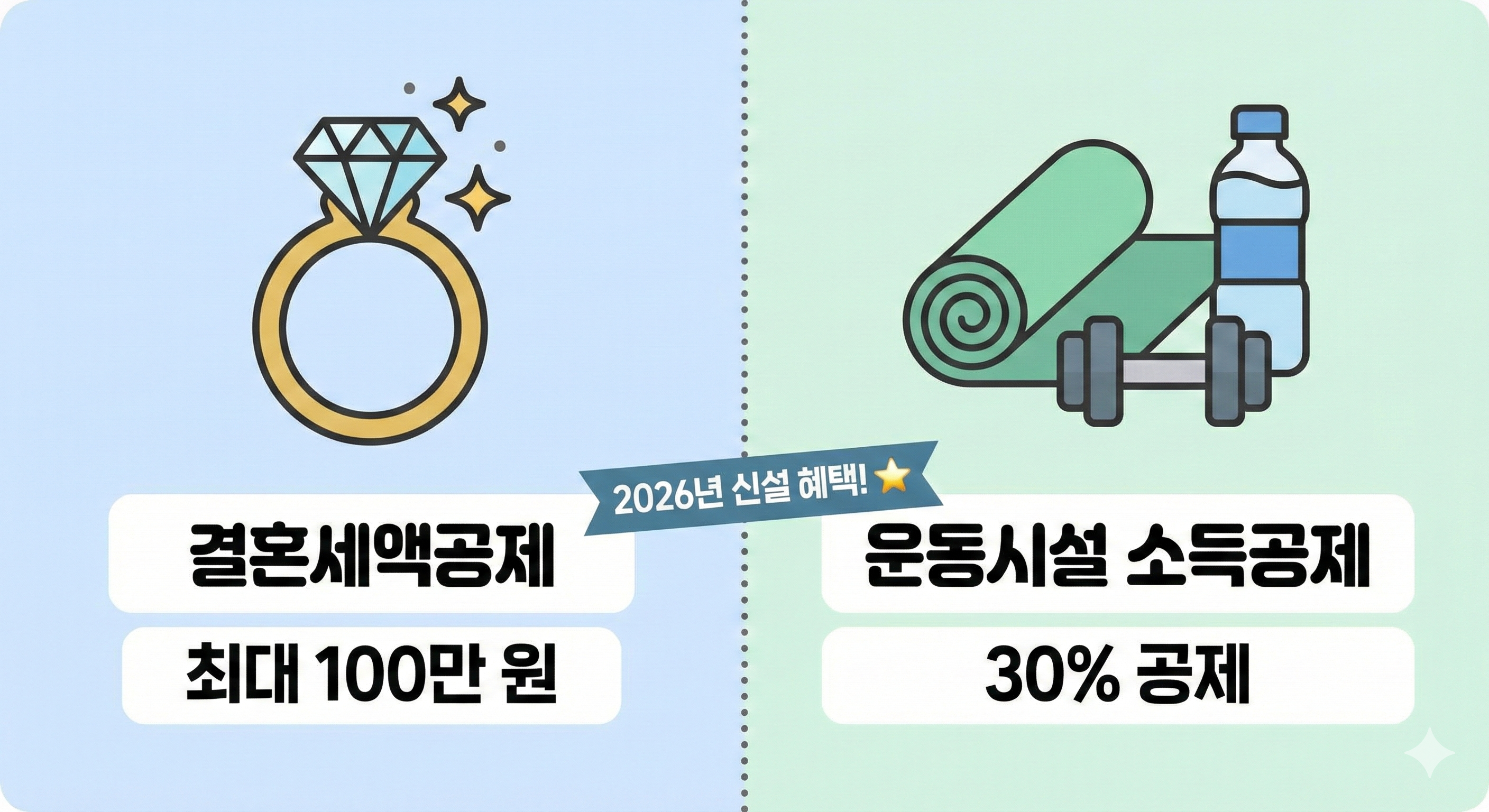 2026년 연말정산(2025년 귀속분)에서 가장 눈에 띄는 변화는 바로 결혼세액공제와 운동시설 이용료 소득공제입니다. 작년에 결혼했거나 건강을 위해 헬스장을 다녔다면 이 항목들을 반드시 체크해야 해요.