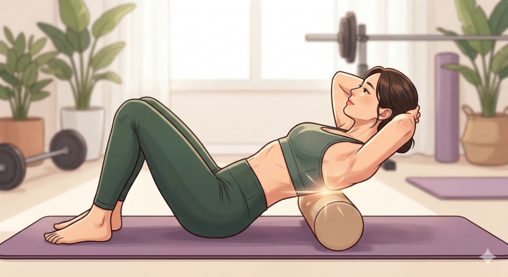 가장 먼저 해야 할 동작은 굽은 등을 직접적으로 펴주는 흉추 신전 운동이에요. 폼롤러를 날개뼈 아래쪽에 가로로 놓은 뒤 무릎을 굽히고 앉아주세요. 양손은 깍지를 끼어 뒷목을 받쳐주시고, 숨을 내뱉으며 상체를 뒤로 천천히 젖혀주세요. 이때 주의할 점은 허리가 과하게 꺾이지 않도록 배에 약간의 힘을 주는 것이에요. 폼롤러의 위치를 위아래로 조금씩 옮겨가며 가장 시원한 지점을 찾아 15초씩 유지해 보세요.