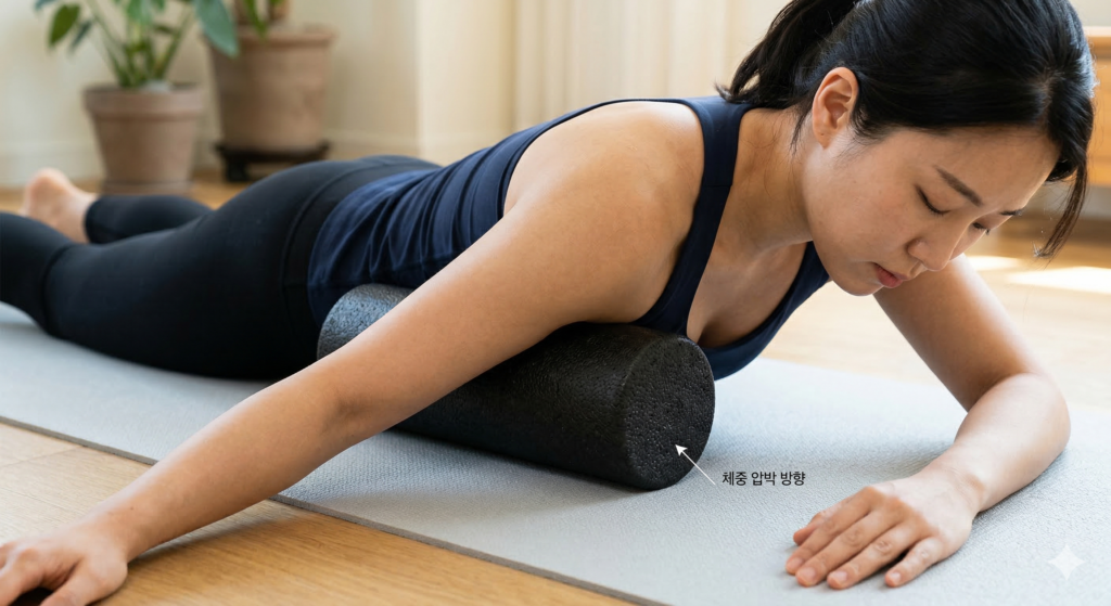 상체를 뒤로 젖힌 상태에서 엉덩이를 살짝 들어 올리고 상하로 움직이며 날개뼈 주변을 마사지해 주세요. 이때 체중의 70% 정도를 폼롤러에 싣는다는 느낌으로 천천히 움직이는 것이 포인트예요. 너무 빨리 움직이면 근육이 놀라 긴장할 수 있으니 호흡과 함께 천천히 진행하는 것이 중요해요. 날개뼈 사이의 능형근이 풀리면서 어깨가 한결 가벼워지는 것을 경험하실 수 있을 거예요.